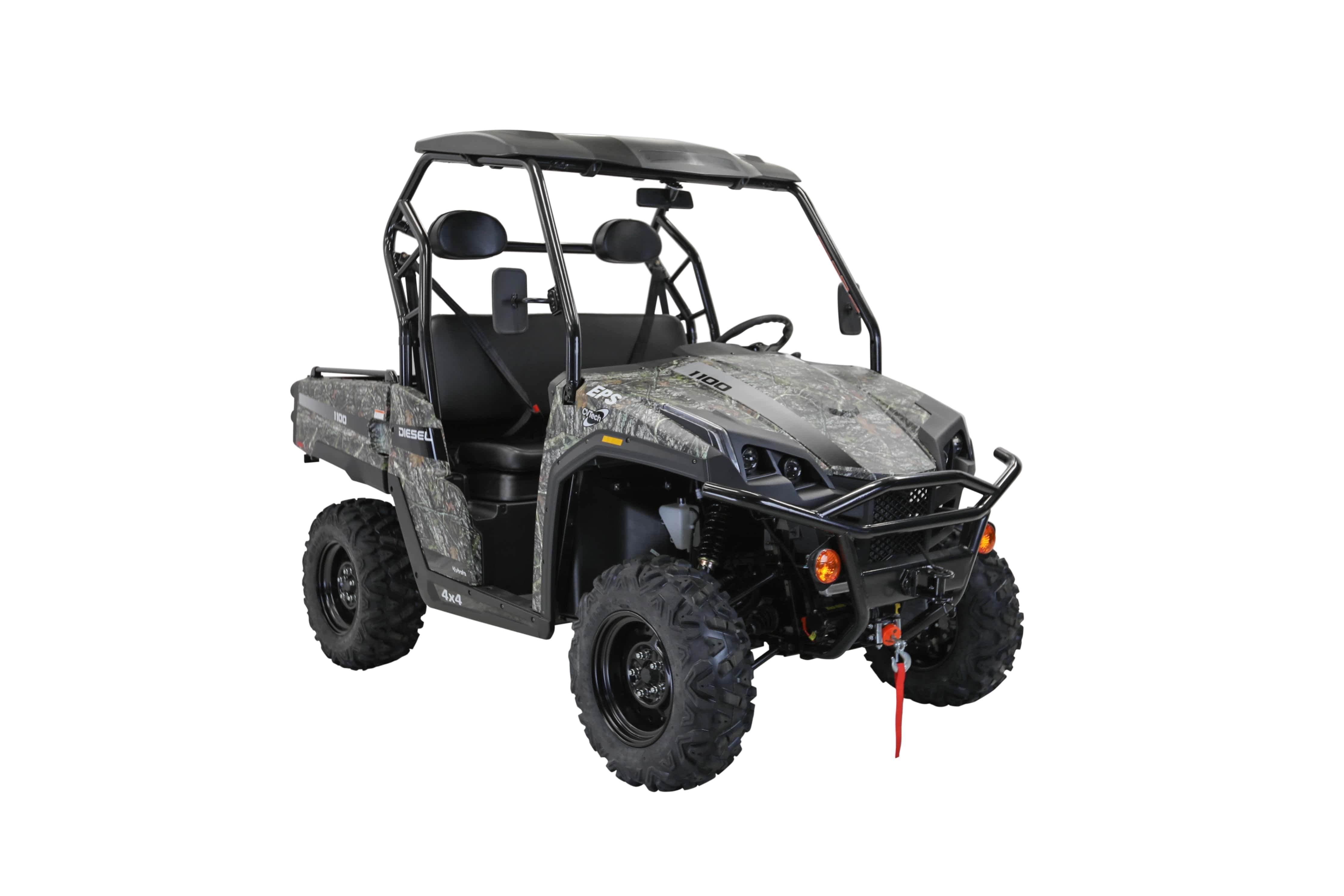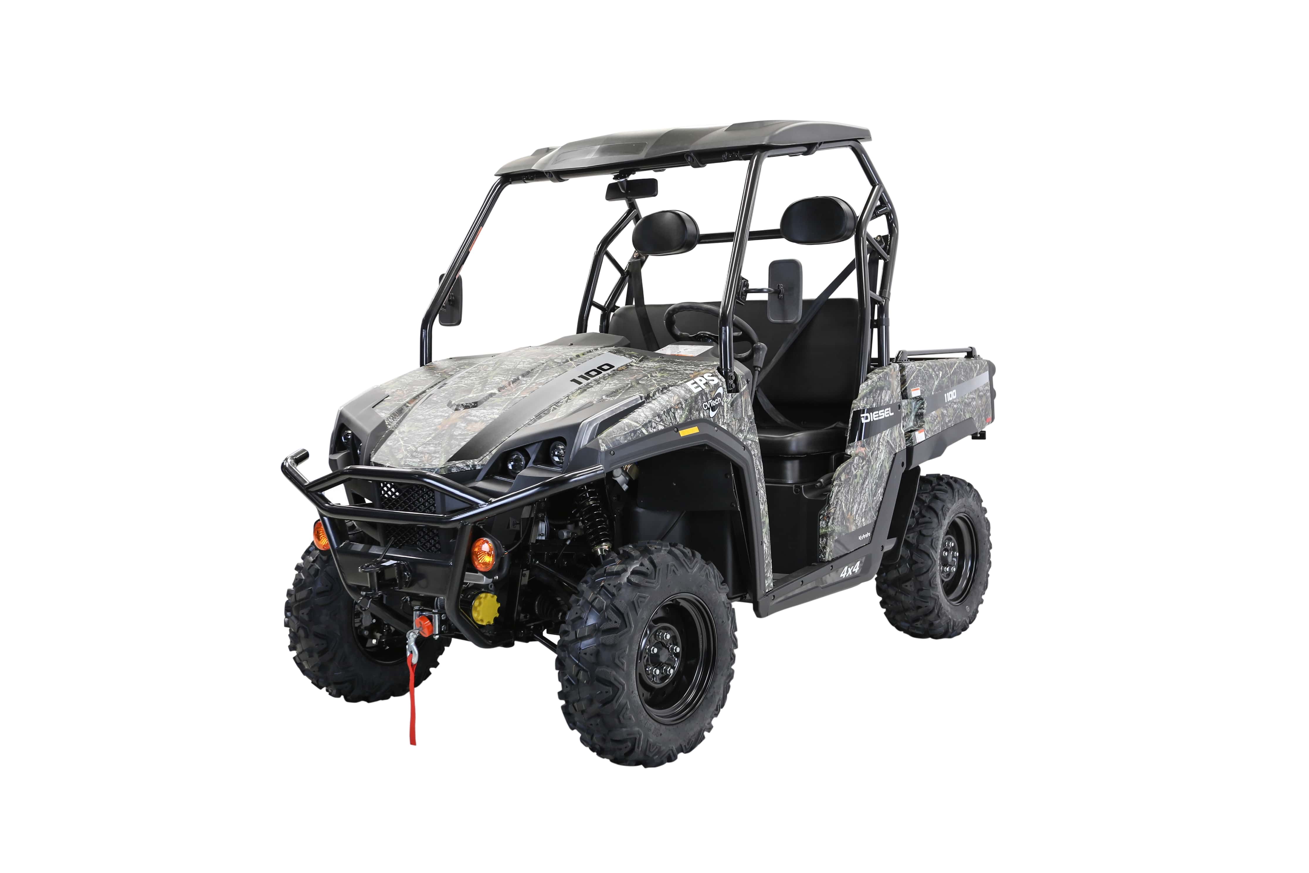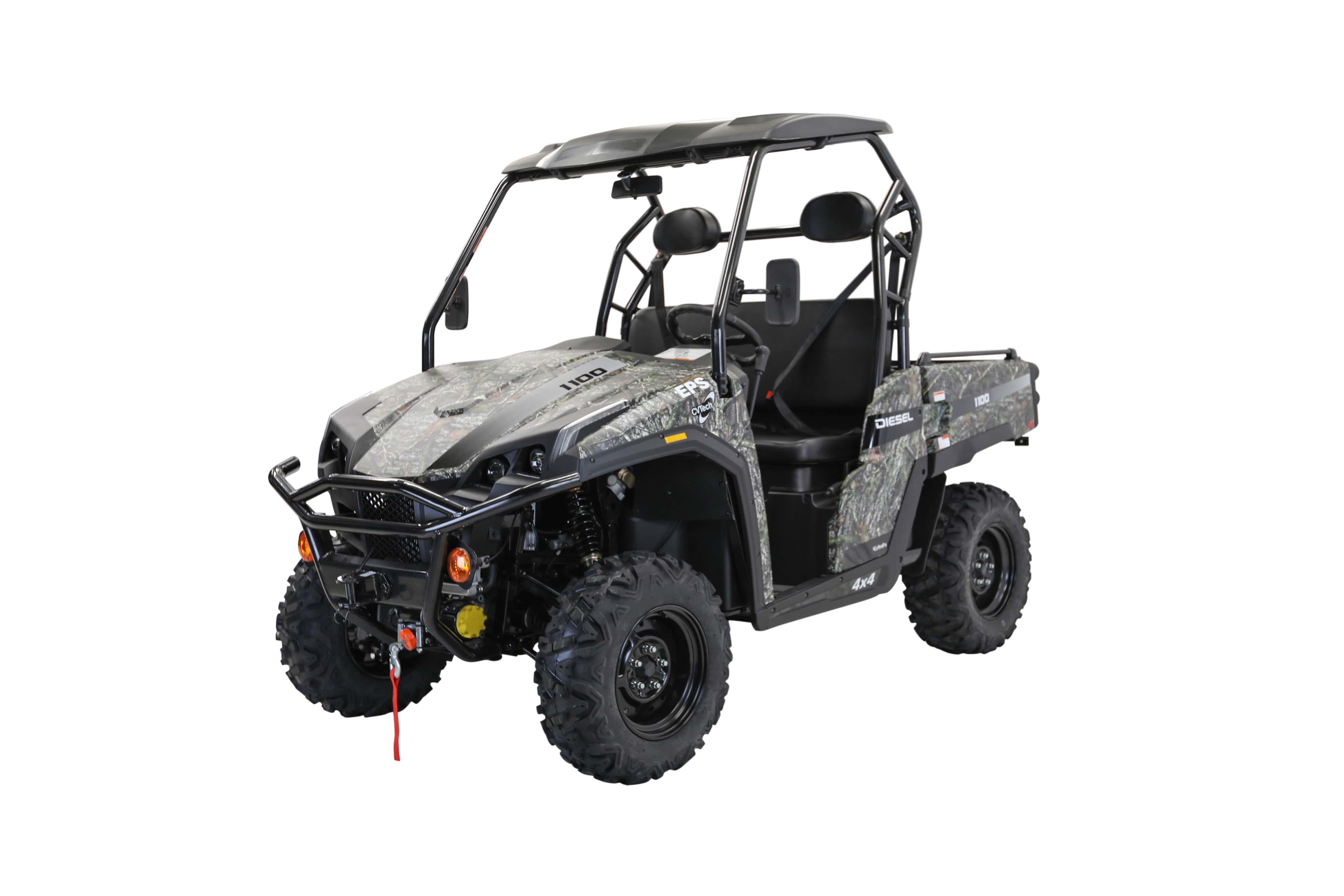 The All-New T-Boss 1100 Diesel UTV. 21% More Power. 62% More Torque. 20% Greater Top Speed. Featuring electronic power steering (EPS), selectable 2WD/4WD drive modes, a tough steel tip tray and over one ton combined tow and carry capacity - plus the extra additions of a roof kit and powerful 4500 lbs winch.